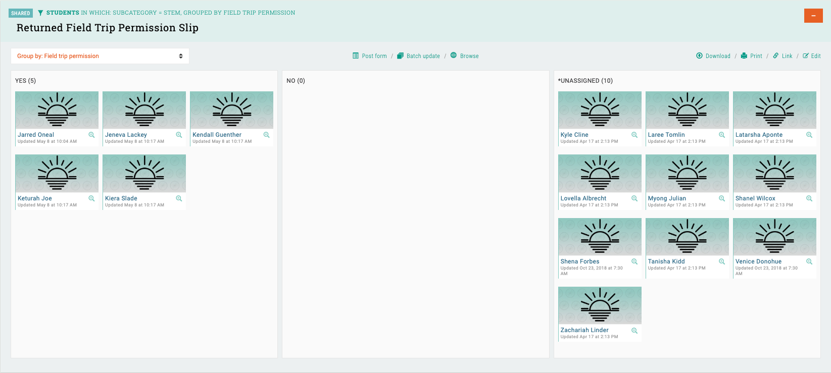 A database on the Grouptrail platform that houses student demographics, attendance and other program data on a single student record: